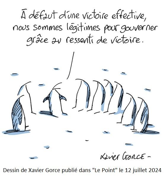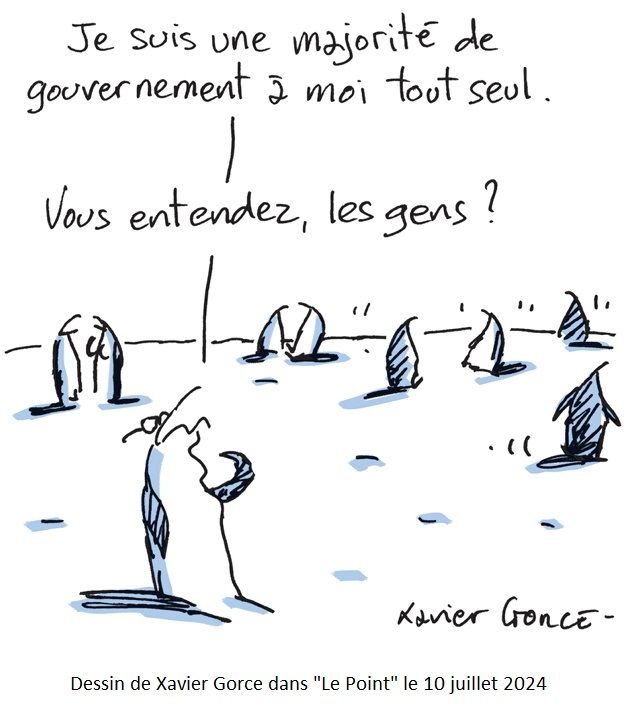 Réponse du grand prêtre : « Non non, je ne suis candidat à rien... », mais la tête montrait justement le contraire, procédé rhétorique bien connu qui veut démentir ce qu'on devrait confirmer. Car pour lui, il n'y a qu'un seul nom pouvant faire le boulot de cette nouvelle farce populaire (NFP), lui-même. Il l'a d'ailleurs dit un peu plus tard, de manière implicite : il n'y a pas besoin de désigner quelqu'un, le Président voit bien qui serait l'homme de la situation, comme dans les autres précédents de cohabitation, en indiquant par exemple que Jacques Chirac n'avait pas été désigné candidat Premier Ministre au bureau politique du RPR en 1986. Mais l'exemple était mal choisi : Jacques Chirac bénéficiait d'une majorité absolue à l'Assemblée Nationale UDF-RPR, certes serrée, mais absolue quand même, ce qui n'est pas du tout le cas du NFP en 2024 (les chiffres sont têtus).