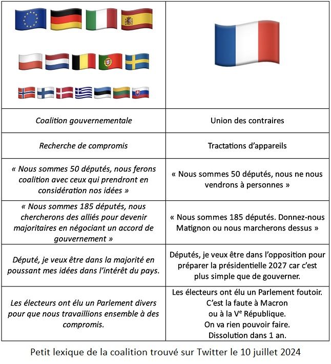 Il est apparemment des partis politiques qui savent mieux que Jean-Luc Mélenchon où se place l'intérêt national (et certainement pas dans l'ego d'un gourou vieilli et aigri). J'ajoute d'ailleurs que ce vendredi soir, l'élection, dès le premier tour, des deux vice-présidentes insoumises de l'Assemblée (Clémence Guetté et Nadège Abomangoli), s'est produite grâce aux voix du RN, ce qui ne semble pas trop émouvoir les insoumis ! (d'autant plus que le RN n'a plus de vice-présidence lui-même).
