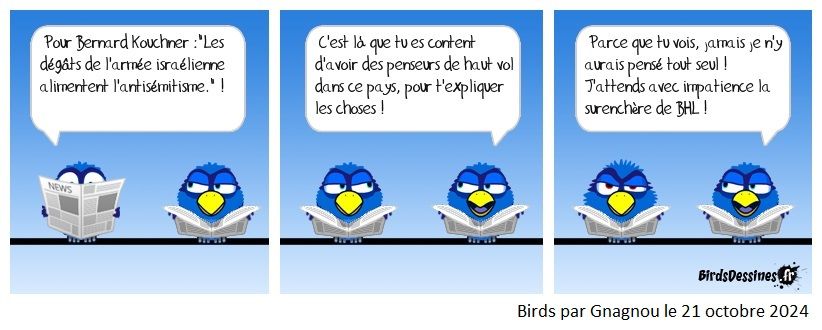 Maintenant, à 85 ans, le French doctor reste toujours présent dans les médias, , même si ses idées sont parfois un peu confuses. Exemple sur Radio J le 20 octobre 2024 ; il s'est aussi exprimé plus récemment sur d'autres chaînes de télévision. Il ne peut pas s'en empêcher. Alors que son petit intérêt serait aujourd'hui de se faire plus discret, de se faire oublier. Ce carriérisme, pourquoi faire, on aurait tendance à dire ? Ou plutôt, tant d'énergie dissipée pour si peu ? Si peu de résultats. Durant la semaine du 5 novembre 2018, Bernard Kouchner était l'invité de l'émission "À voix nue" produite par Annelise Signoret et Martin Quenehen sur France Culture. L'émission commence ainsi : « "Tout bien considéré, il y a deux sortes d’hommes dans le monde : ceux qui restent chez eux et les autres", écrivait Kipling. Et Bernard Kouchner a (tôt) choisi à quelle catégorie il appartenait, pour devenir aventurier de l'humanitaire, du droit d'ingérence et de la politique… ». Il a toujours choisi d'être en dehors. Tant pis pour les enfants...