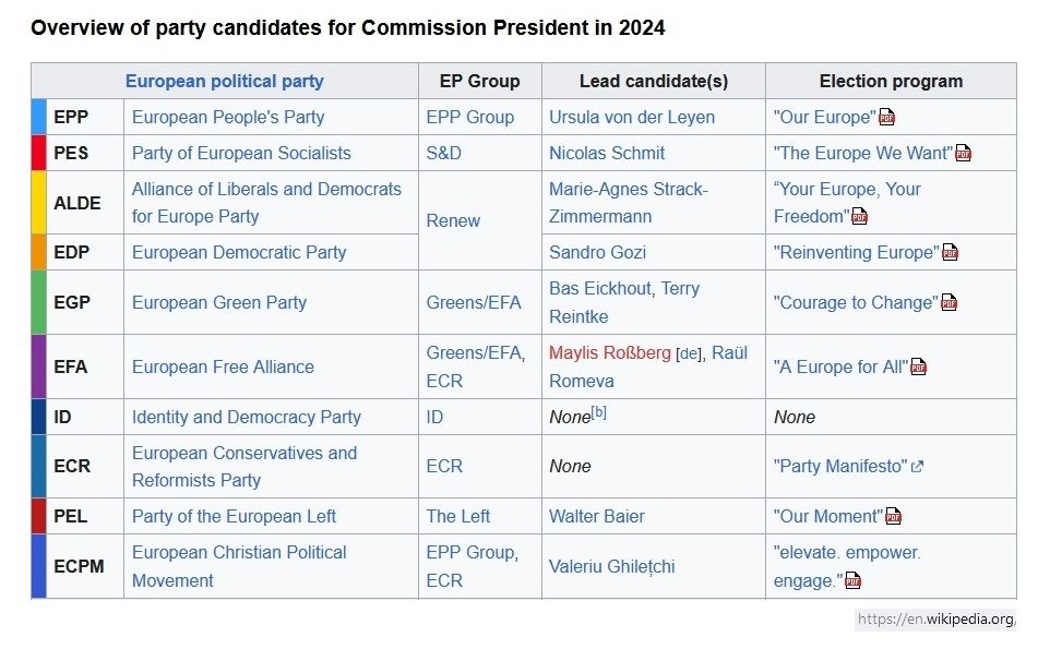 Certes, ce n'est pas obligatoirement le candidat choisi par le parti le plus important qui emporte la nomination, parce qu'il faut l'accord du Conseil Européen, à savoir au moins quinze pays représentant au moins 65% de la population des vingt-sept États membres. Ainsi, Jean-Claude Juncker avait été désigné à la tête de la Commission Européenne en 2014 alors qu'il avait été choisi par son parti, le Parti populaire européen (démocrates chrétiens, c'est-à-dire centre droit), et que le PPE avait gagné les élections. En 2019, en revanche, le PPE avait aussi gagné les élections européennes, mais la France (Emmanuel Macron) a mis un veto pour la désignation du candidat choisi avant les élections, l'Allemand Manfred Weber, président du groupe PPE depuis 2014 (reconduit le 19 juin 2024). Le compromis s'est alors porté sur Ursula von der Leyen, la Ministre allemande de la Défense. Comme le PPE est encore cette fois-ci gagnant, Ursula von der Leyen est bien partie pour être reconduite dans un second mandat de cinq ans (la fonction est limitée à deux mandats de cinq ans) : « Je solliciterai l’approbation du Parlement Européen après la présentation de ma feuille de route politique pour les cinq prochaines années. », a-t-elle confirmé le 27 juin 2024.